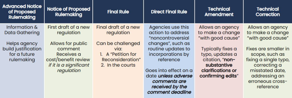 The following chart helps break down where each announcement falls into the rulemaking process.