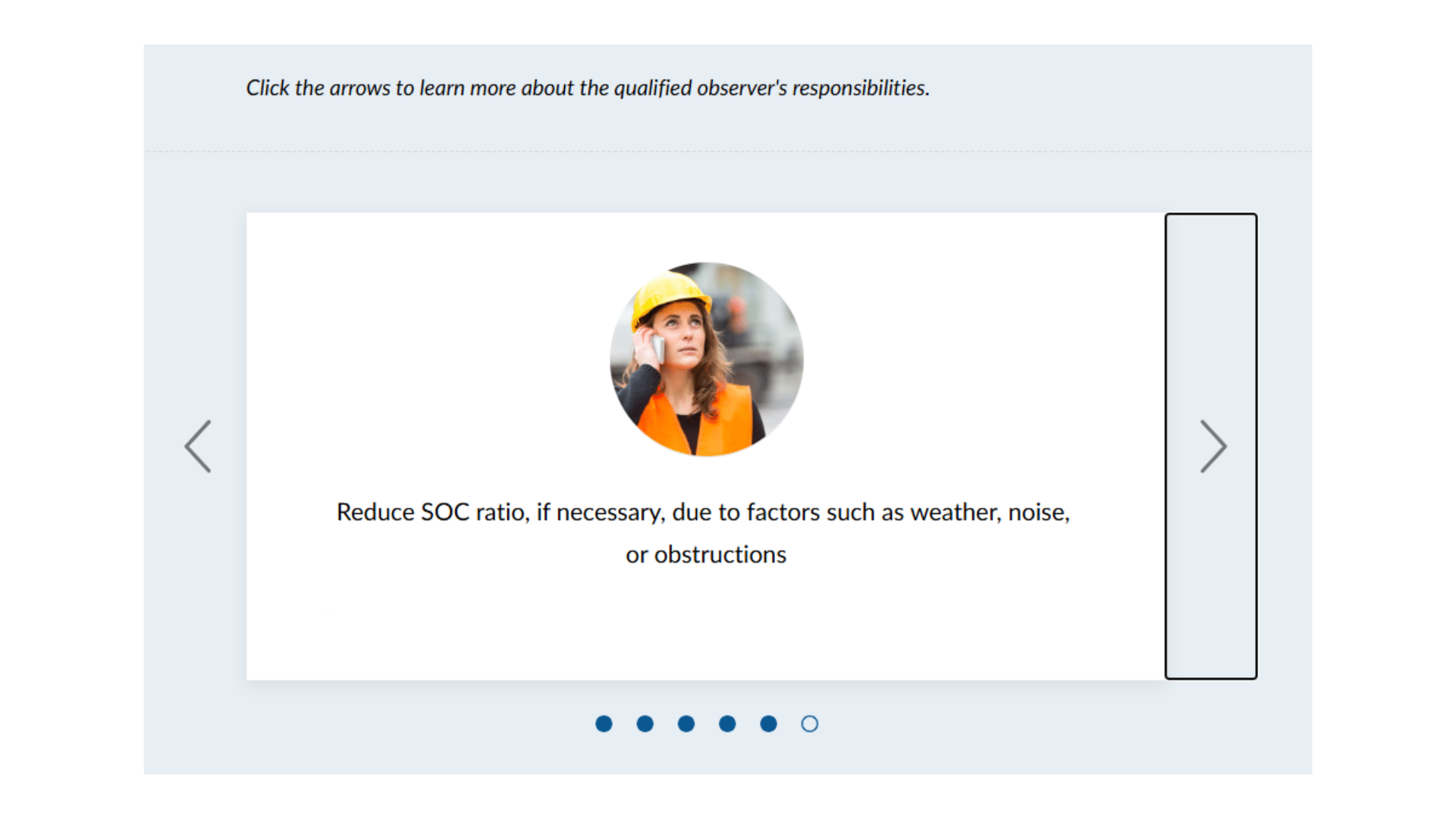 For example, if the conditions on a worksite make it advisable to reduce the number of workers under span of control, the qualified observer may decide to limit span of control. These changes may occur due to factors such as weather conditions, visibility, and other obstructions.